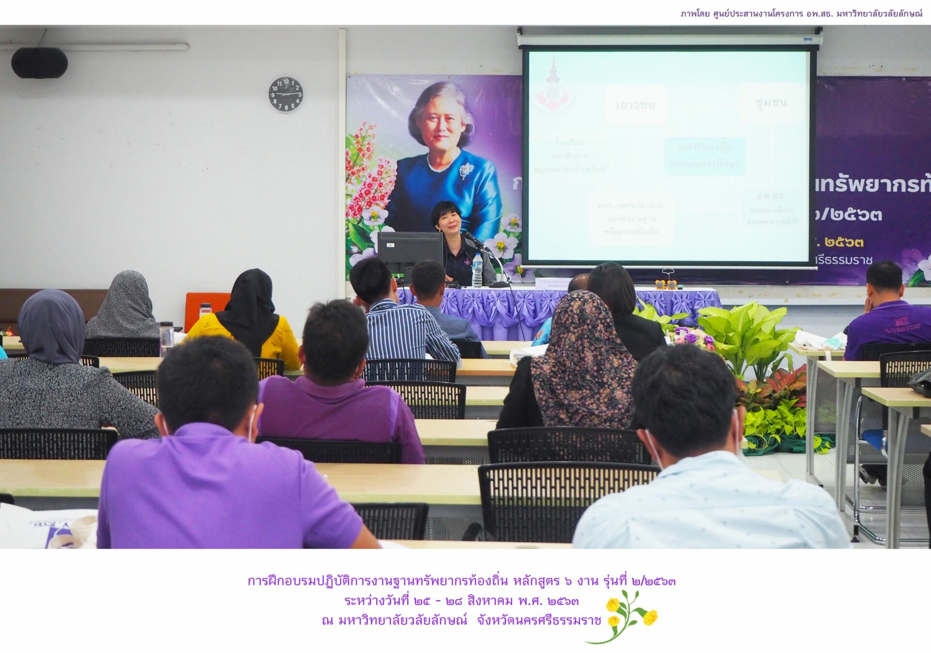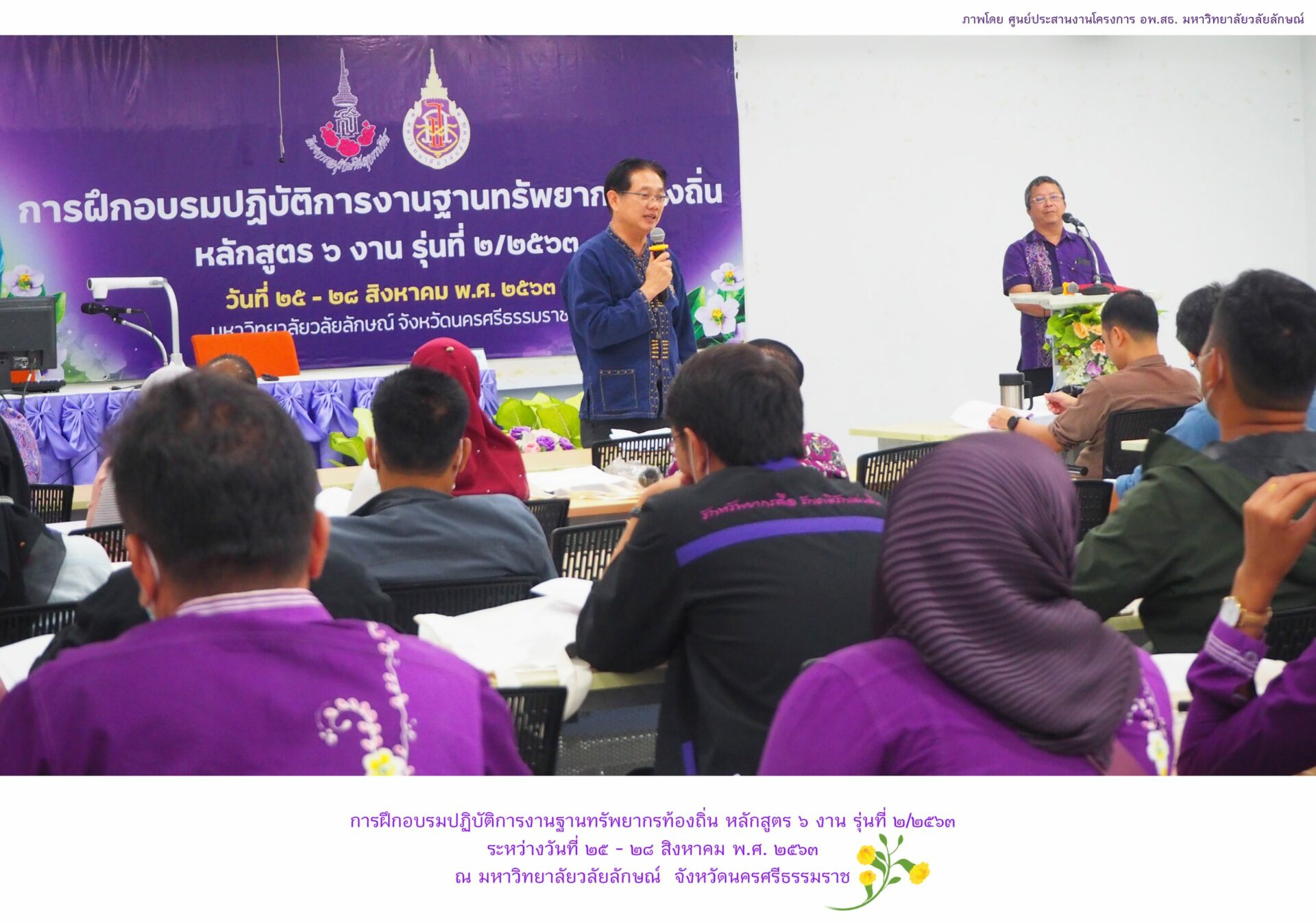 ศาสตราจารย์ ดร.ธวัชชัย ศุภดิษฐ์ รองอธิการบดีฝ่ายวางแผนและยุทธศาสตร์การพัฒนา ผู้แทนอธิการบดีมหาวิทยาลัยวลัยลักษณ์ เป็นประธานกล่าวเปิด การฝึกอบรมปฏิบัติการงานฐานทรัพยากรท้องถิ่น หลักสูตร 6 งานฐานทรัพยากรท้องถิ่น รุ่นที่ 2/2563 โดยมี อาจารย์สุธีะ ทองขาว ผู้อำนวยการอุทยานพฤกษศาสตร์ ในฐานะผู้กำกับดูแลฝ่ายศูนย์ประสานงานและฝึกอบรมโครงการ อพ.สธ. มหาวิทยาลัยวลัยลักษณ์ (อพ.สธ.-มวล.) กล่าวรายงาน พร้อมด้วย ผู้ช่วยศาสตราจารย์ ดวงจิตต์ แก้วอุบล ผู้สนับสนุนมูลนิธิ โครงการ อพ.สธ.คุณมรกต วัชรมุสิก วิทยากรจากโครงการ อพ.สธ. (สำนักพระราชวัง) ผู้บริหารองค์กรปกครองส่วนท้องถิ่น และผู้เข้าร่วมการฝึกอบรมจำนวน 99 คน จาก 27 หน่วยงานทั้งภาครัฐและเอกชน ระหว่างวันที่ 25 – 28 สิงหาคม 2563 ณ ห้องประชุม 4 อาคารปฏิบัติการเทคโนโลยีและพัฒนานวัตกรรม มหาวิทยาลัยวลัยลักษณ์
