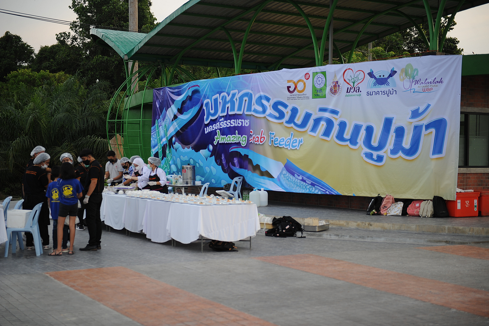 ด้าน ผู้ช่วยศาสตราจารย์ ดร. อมรศักดิ์ สวัสดี ผู้อำนวยการศูนย์บริการวิชาการ ในฐานะหัวหน้าโครงการวิจัยและบริการวิชาการเพื่อฟื้นฟูทรัพยากรปูม้า ม.วลัยลักษณ์ กล่าวว่า งานมหกรรมกินปูม้าในครั้งนี้จัดขึ้นโดยได้รับการสนับสนุนงบประมาณจาก วช. ผ่านการดำเนินโครงการธนาคารปูม้าที่มหาวิทยาลัยวลัยลักษณ์ดูแลในพื้นที่จังหวัดนครศรีธรรมราช และจังหวัดสุราษฎร์ธานี จำนวนกว่า 84 แห่ง มีเป้าหมายเพื่อกระตุ้นการซื้อขายสินค้าทั้งที่เป็นสินค้าปูม้า สินค้าอาหารทะเลอื่นๆ และร้านค้าชุมชน เพื่อสร้างกลไกเศรษฐกิจหมุนเวียนในพื้นที่จังหวัดนครศรีธรรมราช โดยมีเครือข่ายธนาคารปูม้าทั้ง 6 อำเภอชายฝั่งจังหวัดนครศรีธรรมราช ได้แก่ อำเภอขนอม สิชล ท่าศาลา เมืองนครศรีธรรมราช ปากพนัง และหัวไทร เข้าร่วมกิจกรรมจัดตั้งบูท ออกร้านจำหน่ายสินค้าปูม้าและอาหารทะเล ภายใต้มมาตรการป้องการแพร่ระบาดของเชื้อโควิด19 อย่างเข้มข้นอีกด้วย