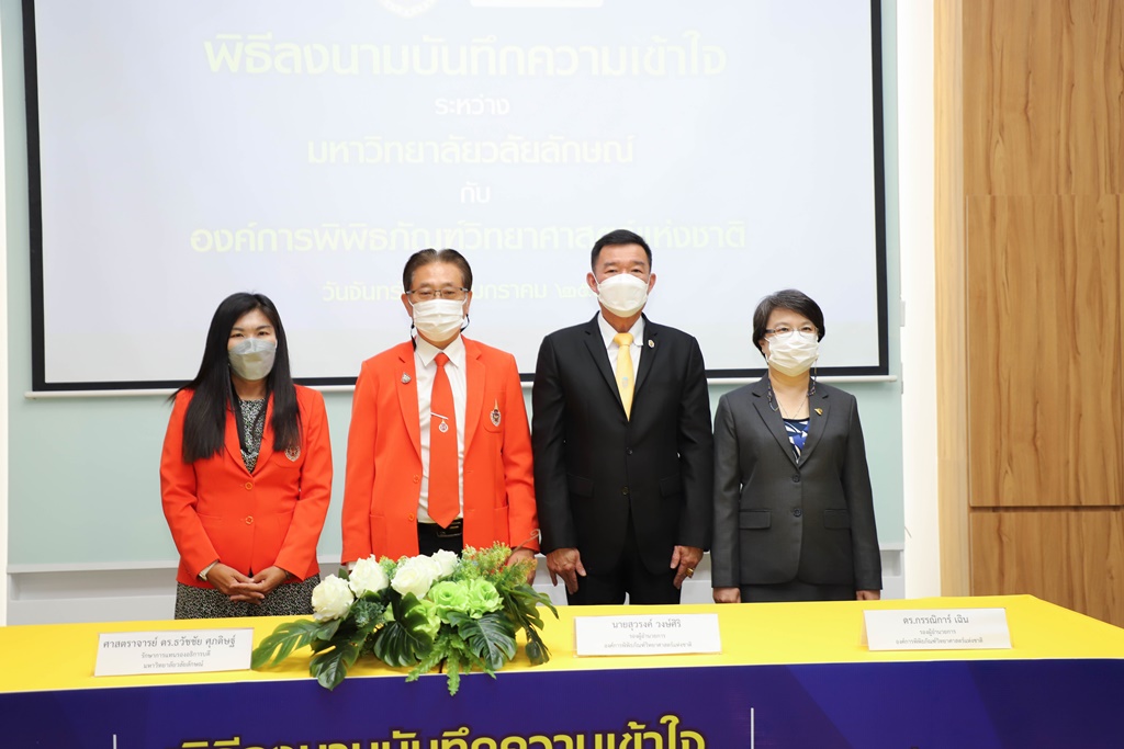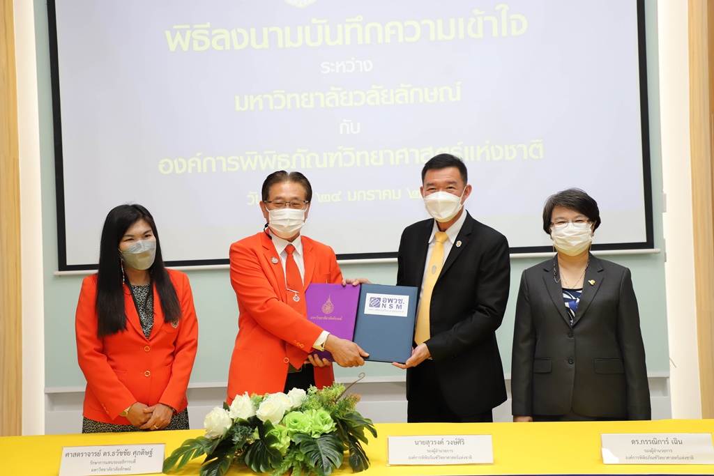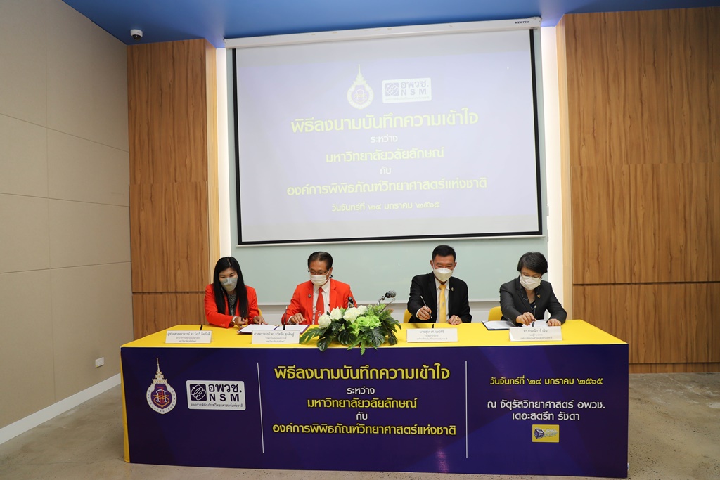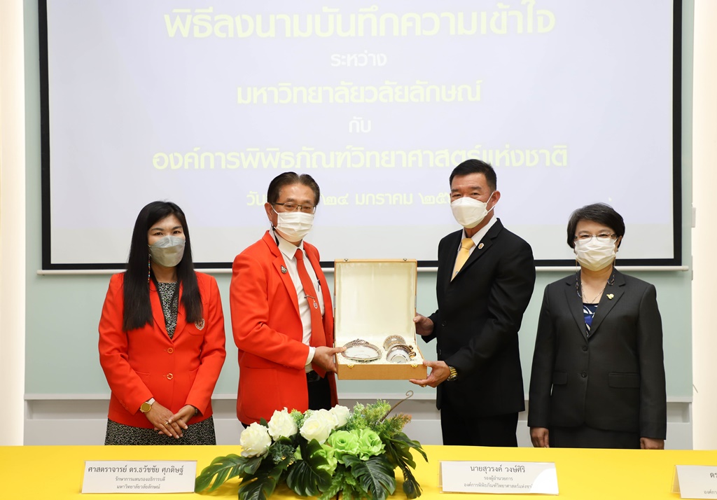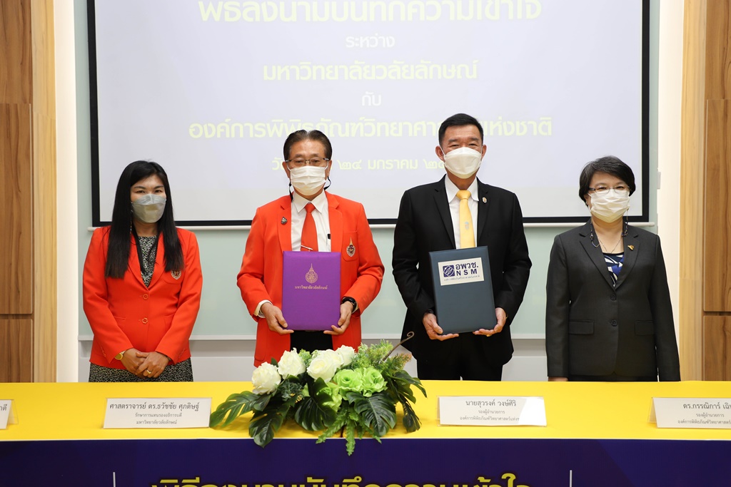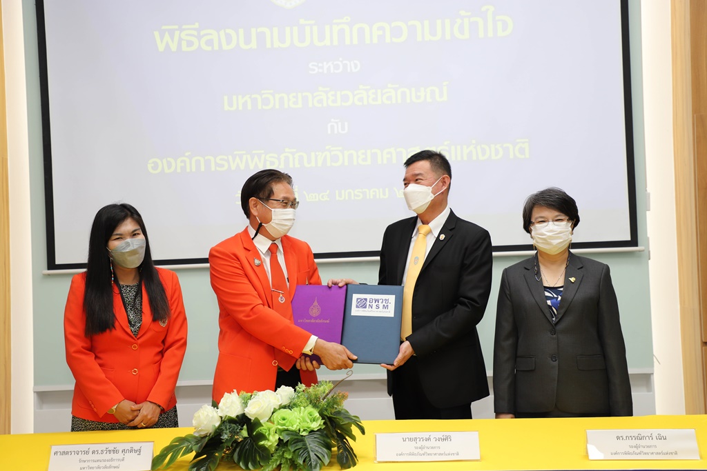 ศาสตราจารย์ ดร.ธวัชชัย ศุภดิษฐ์ รักษาการแทนรองอธิการบดี ในนามผู้แทนอธิการบดีมหาวิทยาลัยวลัยลักษณ์ ลงนามบันทึกความเข้าใจร่วมกับ นายสุวรงค์ วงษ์ศิริ รองผู้อำนวยการองค์การพิพิธภัณฑ์วิทยาศาสตร์แห่งชาติ โดยมี ผู้ช่วยศาสตราจารย์ ดร.รุ่งรวี จิตภักดี ผู้อำนวยการอุทยานพฤกษศาสตร์ มหาวิทยาลัยวลัยลักษณ์ และ ดร.กรรณิการ์ เฉิน รองผู้อำนวยการองค์การพิพิธภัณฑ์วิทยาศาสตร์แห่งชาติ เป็นพยานในพิธีลงนาม เมื่อวันที่ 24 มกราคม 2565 ณ จัตุรัสวิทยาศาสตร์ อพวช. เดอะ สตรีท รัชดา กรุงเทพมหานคร