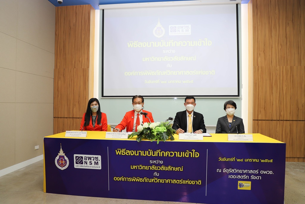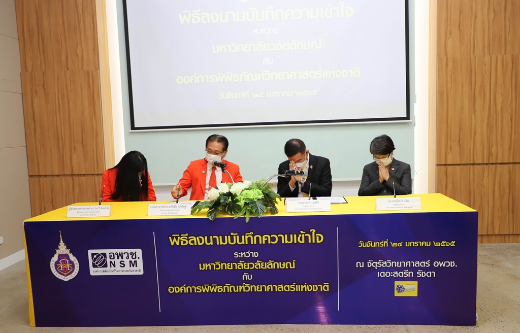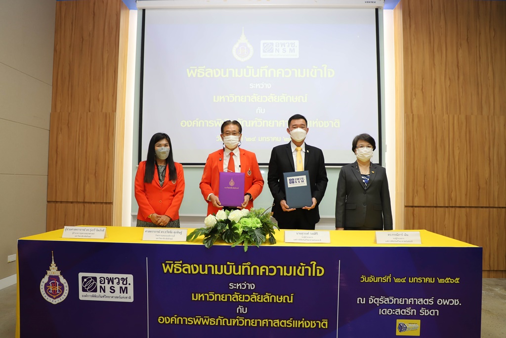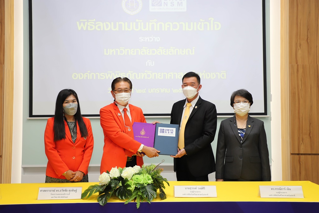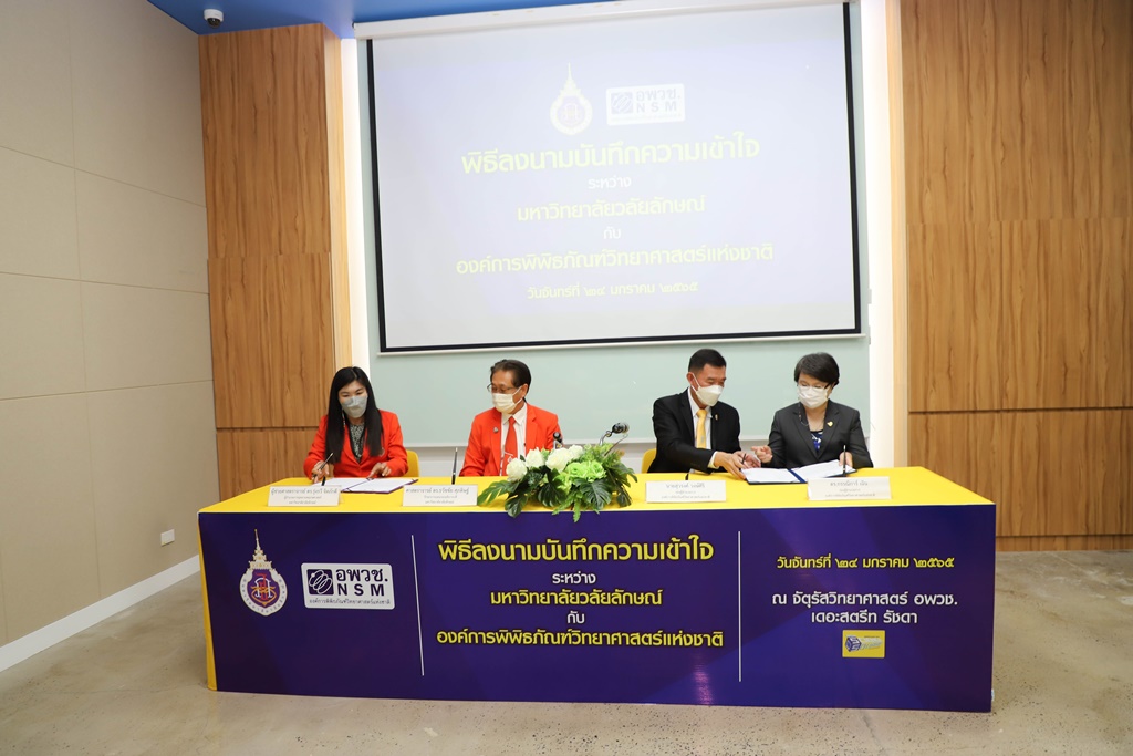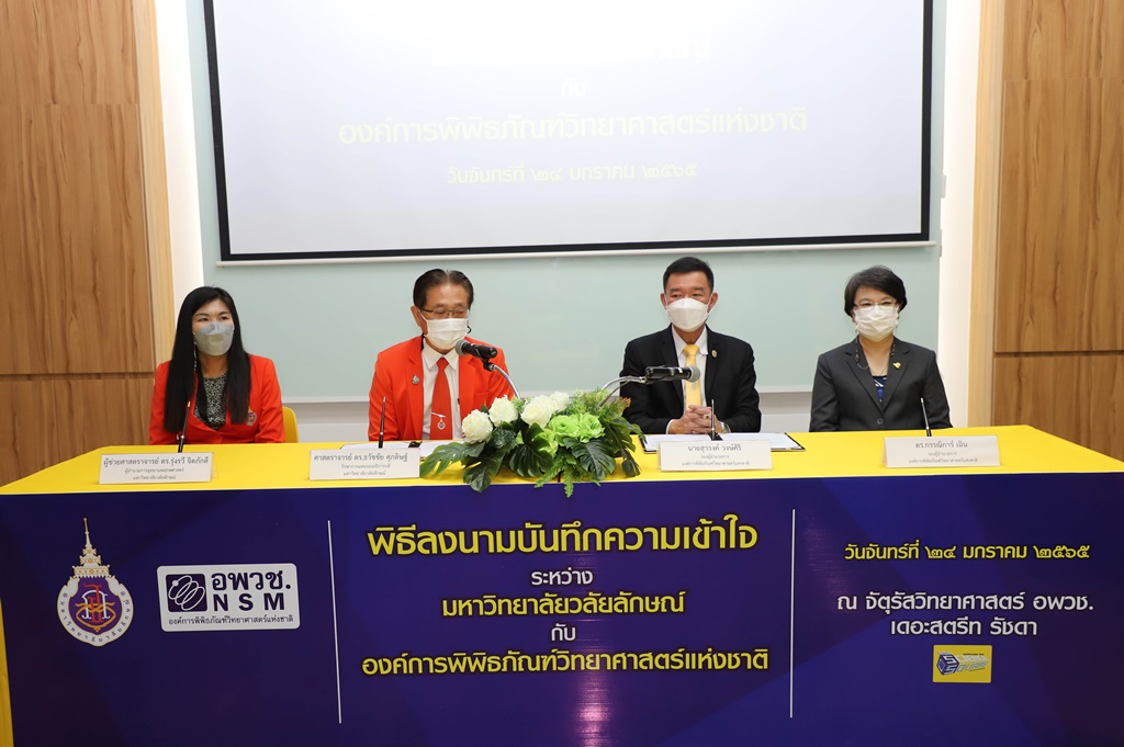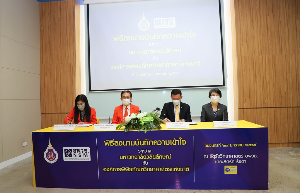 ศาสตราจารย์ ดร.ธวัชชัย ศุภดิษฐ์ รักษาการแทนรองอธิการบดี ในนามผู้แทนอธิการบดีมหาวิทยาลัยวลัยลักษณ์ ลงนามบันทึกความเข้าใจร่วมกับ นายสุวรงค์ วงษ์ศิริ รองผู้อำนวยการองค์การพิพิธภัณฑ์วิทยาศาสตร์แห่งชาติ โดยมี ผู้ช่วยศาสตราจารย์ ดร.รุ่งรวี จิตภักดี ผู้อำนวยการอุทยานพฤกษศาสตร์ มหาวิทยาลัยวลัยลักษณ์ และ ดร.กรรณิการ์ เฉิน รองผู้อำนวยการองค์การพิพิธภัณฑ์วิทยาศาสตร์แห่งชาติ เป็นพยานในพิธีลงนาม เมื่อวันที่ 24 มกราคม 2565 ณ จัตุรัสวิทยาศาสตร์ อพวช. เดอะ สตรีท รัชดา กรุงเทพมหานคร