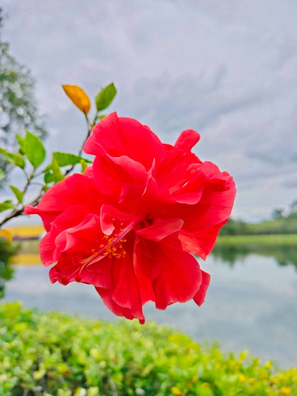 4. ลักษณะเด่น : ไม้พุ่มสูงราว 1–4 เมตร ใบเดี่ยวรูปรีปลายแหลม ผิวใบเป็นมัน ดอกเดี่ยวขนาด 8–15 ซม. สีแดงสด (มีพันธุ์สีอื่นได้) เกสรตัวผู้รวมเป็นหลอดเด่นยื่นพ้นกลีบดอก ออกดอกได้เกือบตลอดปี แสงจัด–น้ำเพียงพอช่วยให้ดอกดก เหมาะกับแปลงสาธิตและแนวรั้วเขียวในสวนเรียนรู้