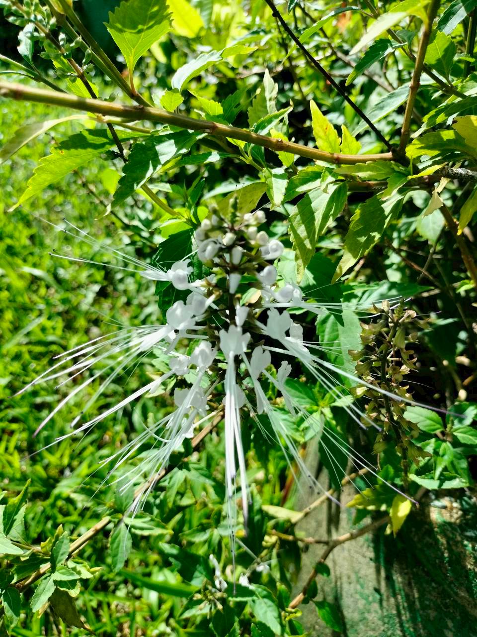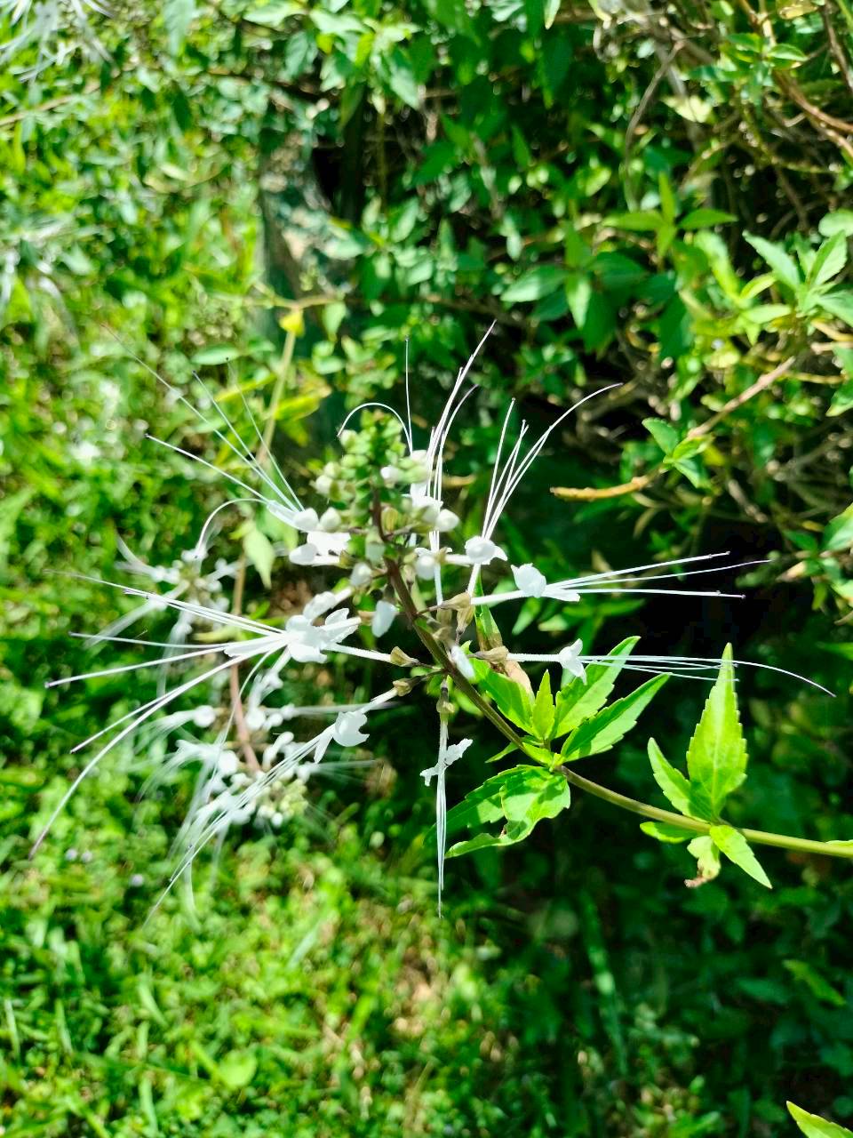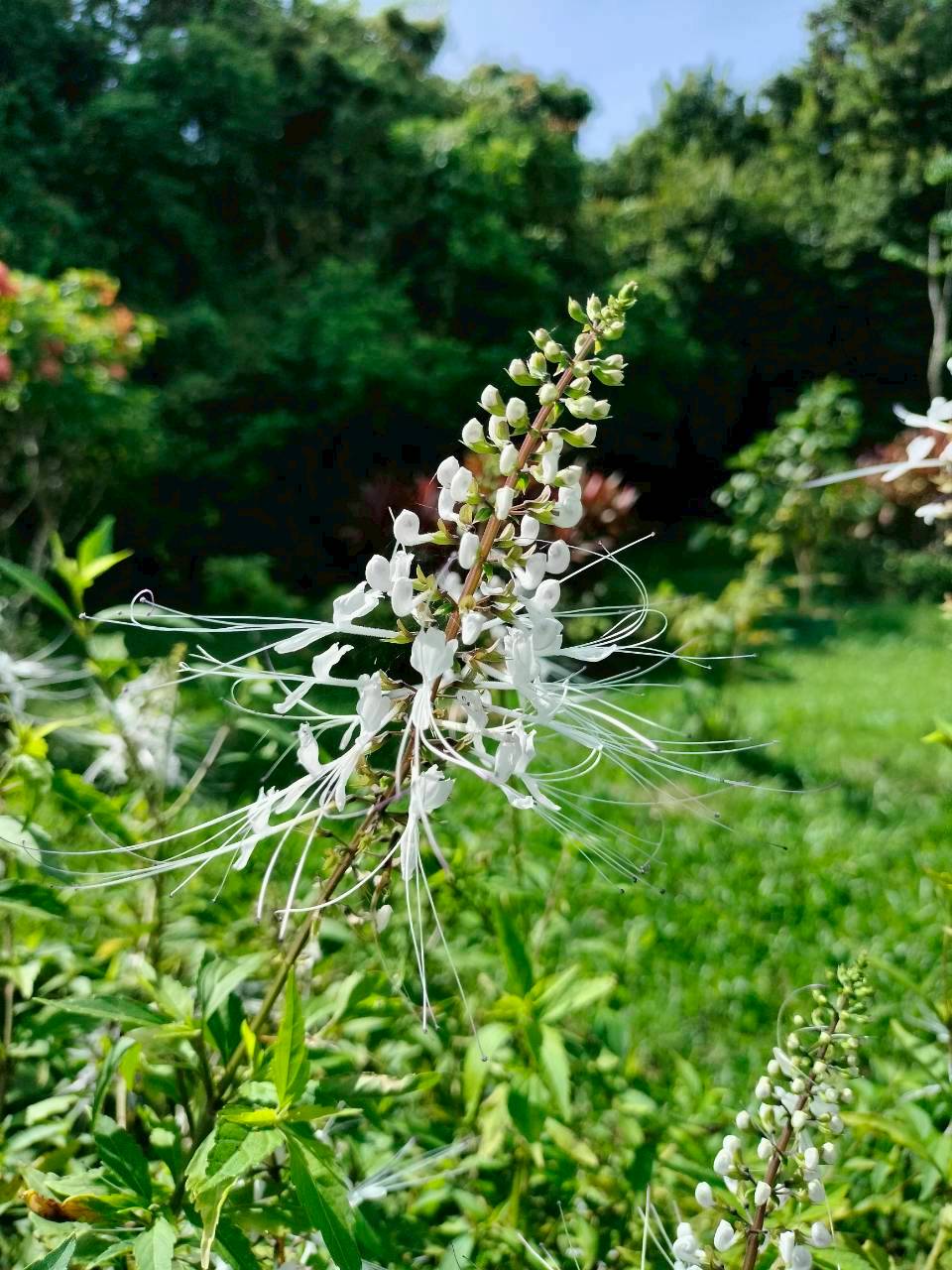 4. ลักษณะเด่น : ไม้ล้มลุกสูงประมาณ 30–80 ซม. ใบเดี่ยว รูปไข่ ขอบใบหยักเล็กน้อย ดอกออกเป็นช่อปลายยอด สีขาว (บางพันธุ์มีม่วงอ่อน) เกสรยื่นยาวเด่นคล้ายหนวดแมวซึ่งเป็นเอกลักษณ์จำแนกชนิด