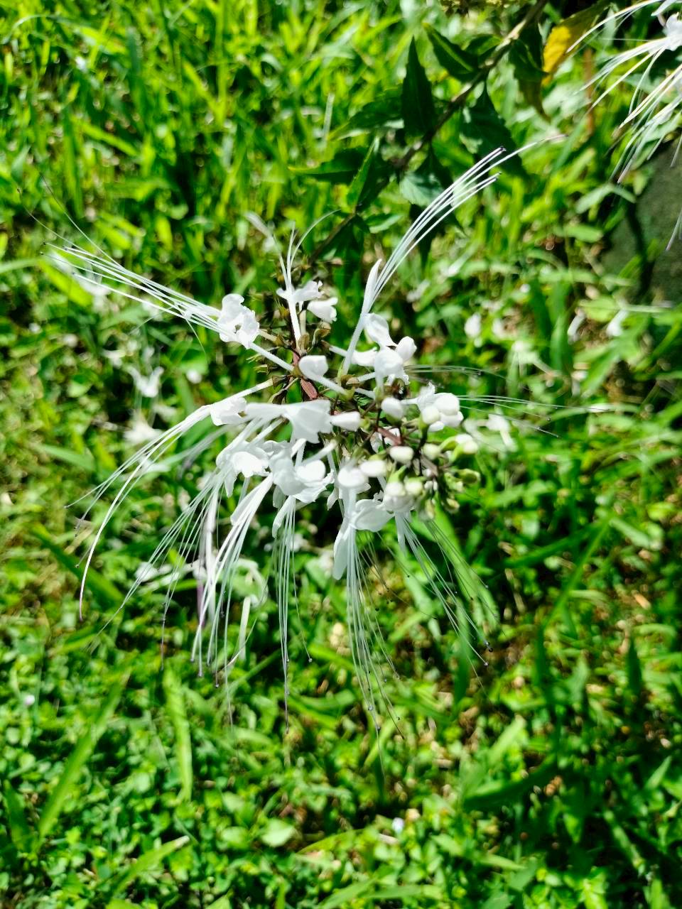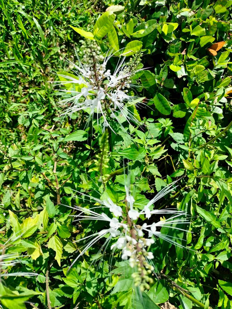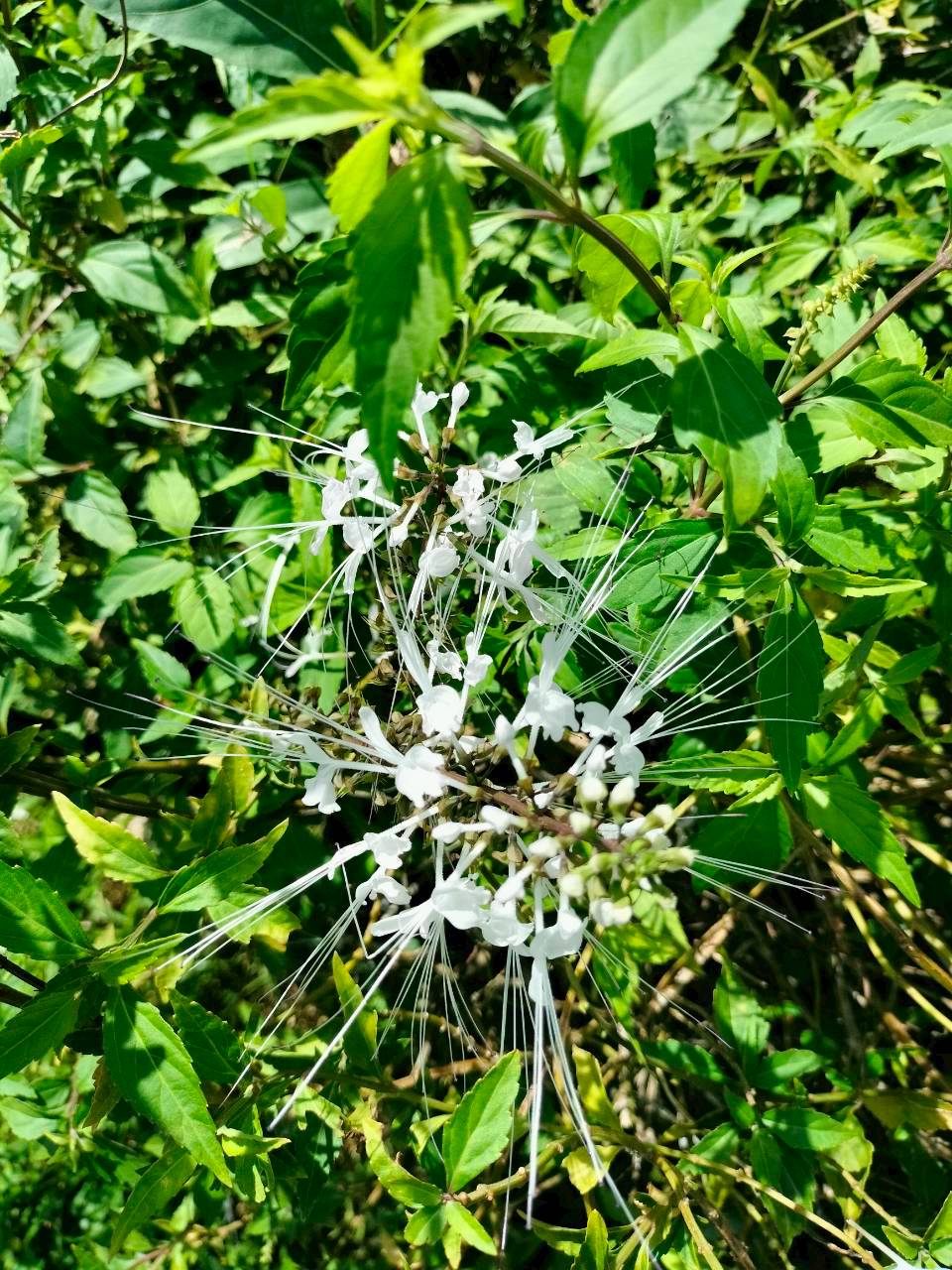 4. ลักษณะเด่น : ไม้ล้มลุกสูงประมาณ 30–80 ซม. ใบเดี่ยว รูปไข่ ขอบใบหยักเล็กน้อย ดอกออกเป็นช่อปลายยอด สีขาว (บางพันธุ์มีม่วงอ่อน) เกสรยื่นยาวเด่นคล้ายหนวดแมวซึ่งเป็นเอกลักษณ์จำแนกชนิด