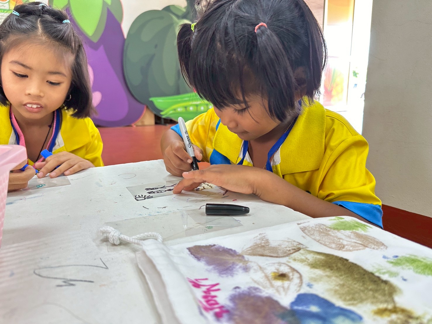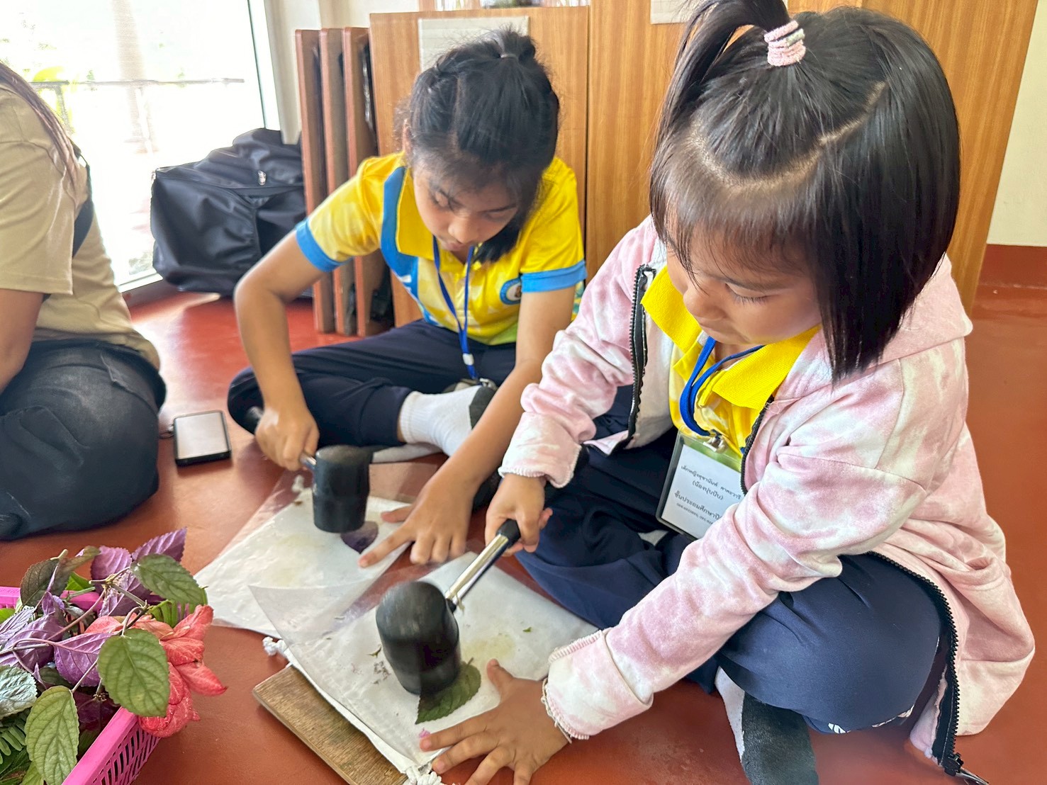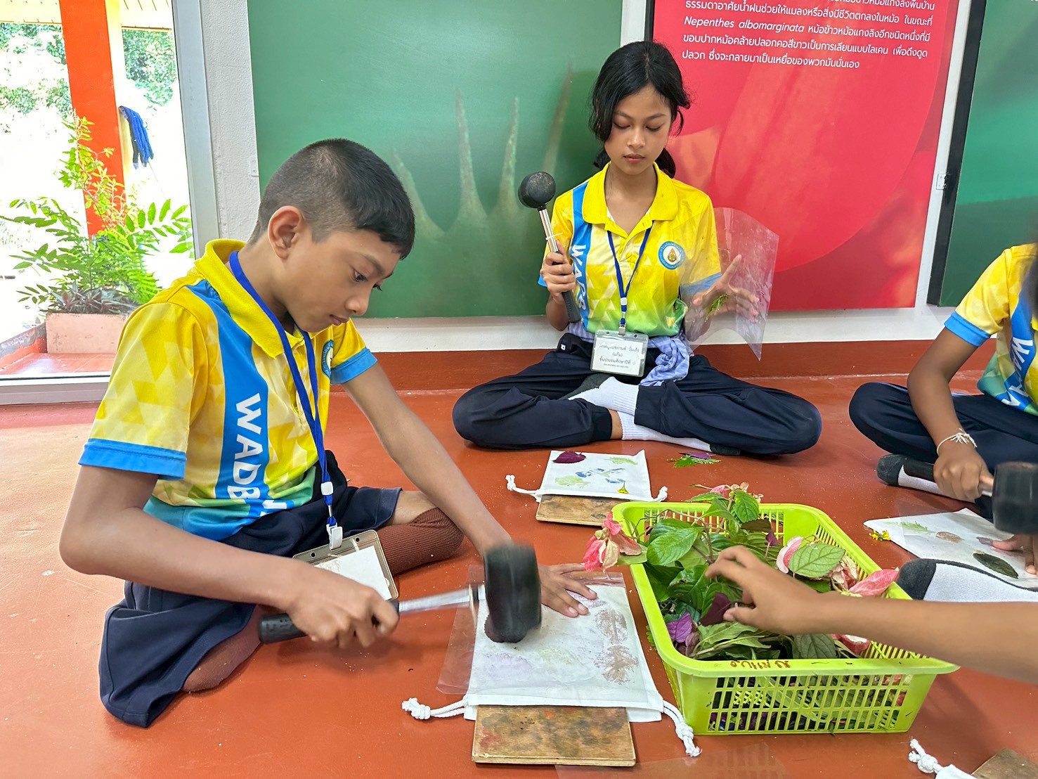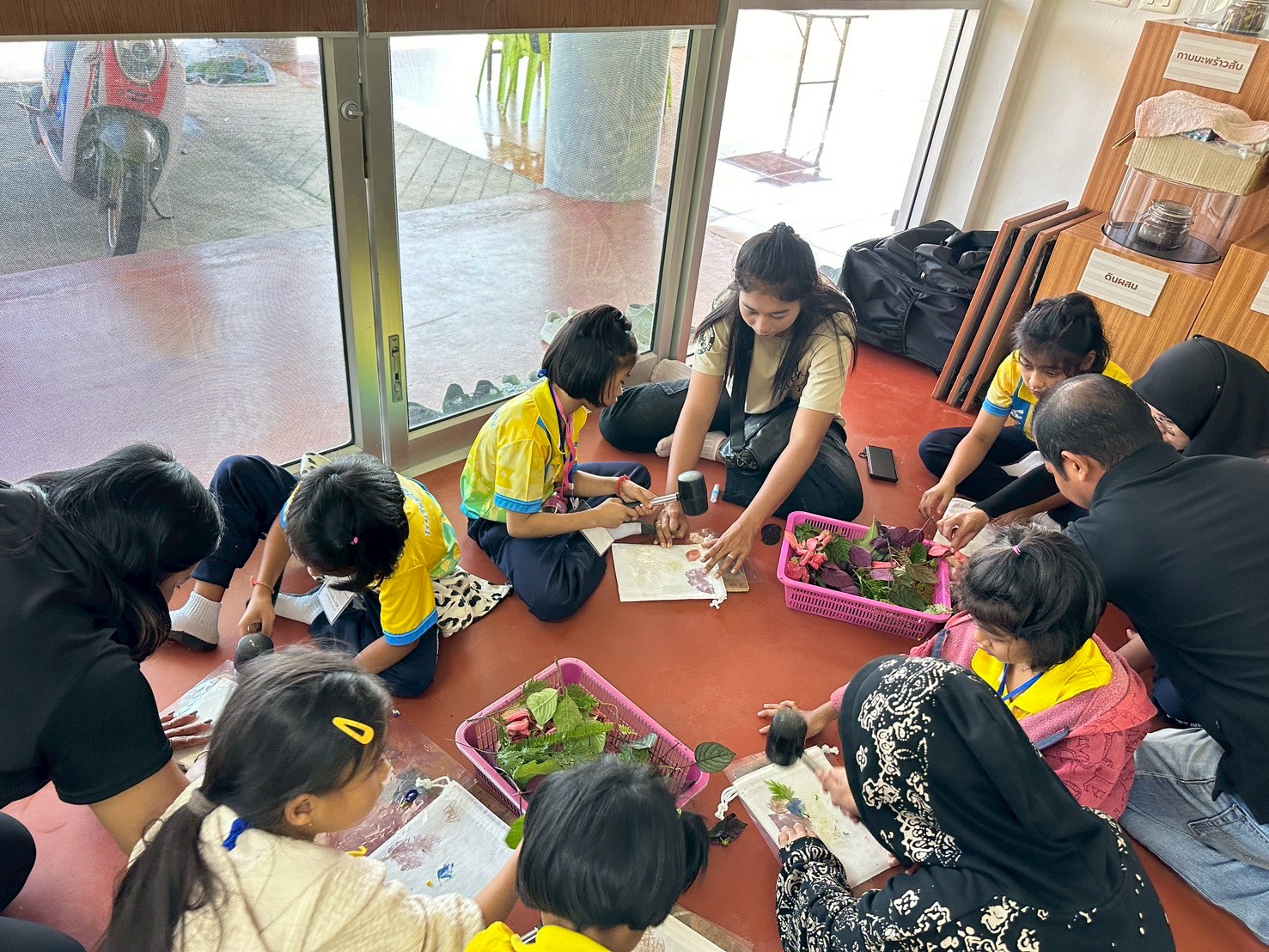 1. กิจกรรม Eco Print นักเรียนได้เรียนรู้หลักการพื้นฐานของสีจากธรรมชาติ ผ่านการทดลองพิมพ์ลายใบไม้ ดอกไม้ ลงบนผืนผ้า กระดาษ หรือวัสดุที่กำหนด โดยวิทยากรอธิบายถึงชนิดของพืชที่เหมาะสม เทคนิคการจัดวางลวดลาย และขั้นตอนการทำให้สีติดบนวัสดุ ช่วยให้ผู้เรียนเข้าใจความเชื่อมโยงระหว่างวิทยาศาสตร์ ศิลปะ และทรัพยากรธรรมชาติ