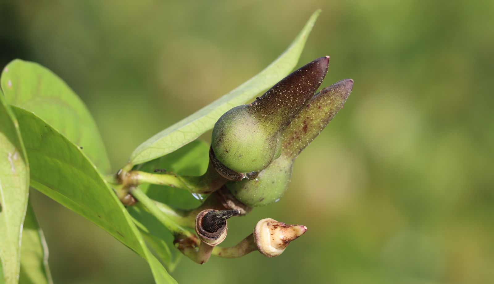 ลักษณะเป็นฝักกลม ปลายเป็นจะงอย เมื่อแก่จะแตกออกเป็น 2 ซีก
